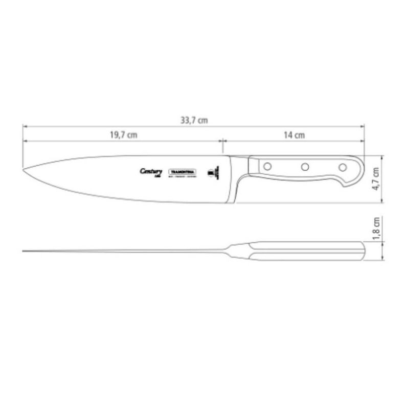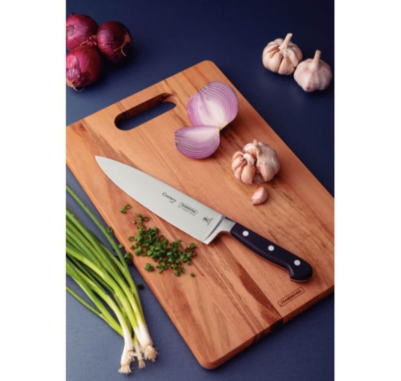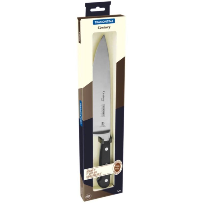 Para os apaixonados pelo mundo da gastronomia, a faca chef Tramontina Century com lâmina em aço inox e cabo em policarbonato e fibra de vidro 8 polegadas é a faca ideal. Com ela criar receitas e manipular diversos ingredientes é muito mais prático, pois tem lâmina em aço inox com tratamento térmico que assegura um corte rápido e preciso, além de garantir a longevidade do fio. Seu cabo de policarbonato com fibra de vidro possui formato anatômico, que proporciona conforto e segurança durante o uso. Desenvolvida especialmente para uso intenso, possui 25 anos de garantia contra defeitos de fabricação. A Faca Chef Tramontina é ideal para cortar, fatiar, filetar e picar alimentos diversos, um item indispensável para sua cozinha!