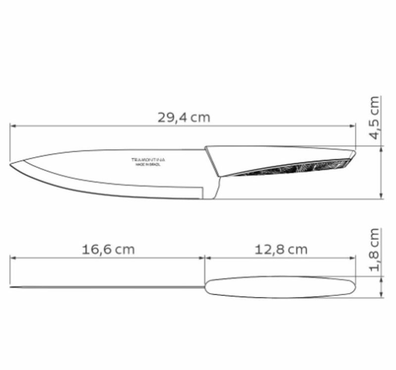 Modo de Uso: Para maior durabilidade do produto recomenda-se secar bem antes de guardar, mesmo após lavagem em máquina. Recomenda-se o uso de tábuas de polipropileno ou madeira da Tramontina para maior durabilidade do fio da faca. Não é indicado o uso da faca para o corte de alimentos congelados. Mantenha sempre sua faca afiada utilizando os afiadores da Tramontina. Para descarte dos produtos e embalagem siga as orientações de reciclagem vigentes.