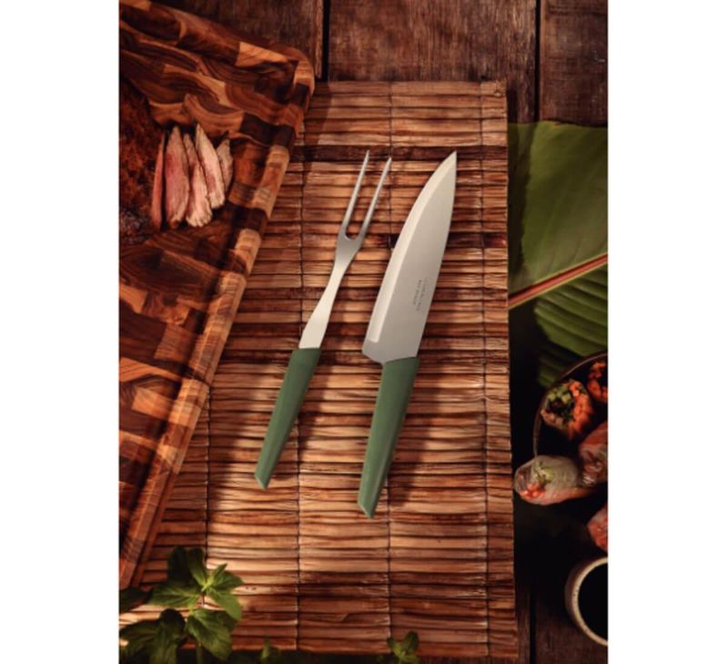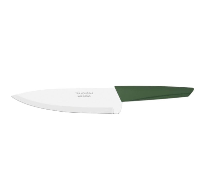 Toda a versatilidade da protagonista da cozinha: a faca chef Tramontina LYF com lâmina em aço inox e cabo de polipropileno PCR verde natureza 7 polegadas. Desenvolvida com materiais reciclados e recicláveis, ela é uma faca para o uso com os mais diversos alimentos e variados tipos de preparos. Sua lâmina é produzida em aço inox e seu cabo é em polipropileno PCR, características que garantem excelente poder de corte, alta resistência e durabilidade, além de permitir que seja levada à máquina de lavar louças. Inspirada em elementos naturais, tais como o vento e a folha, ela tem formas fluidas e é a escolha mais sustentável para sua cozinha!