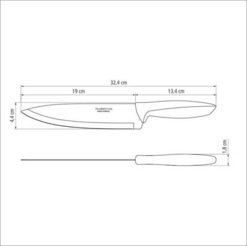 Modo de Uso: Para maior durabilidade do produto recomenda-se secar bem antes de guardar, mesmo após lavagem em máquina. Recomenda-se o uso de tábuas de polipropileno ou madeira da Tramontina para maior durabilidade do fio da faca. Não é indicado o uso da faca para o corte de alimentos congelados. Mantenha sempre sua faca afiada utilizando os afiadores da Tramontina. Para descarte dos produtos e embalagens siga as orientações de reciclagem vigentes.