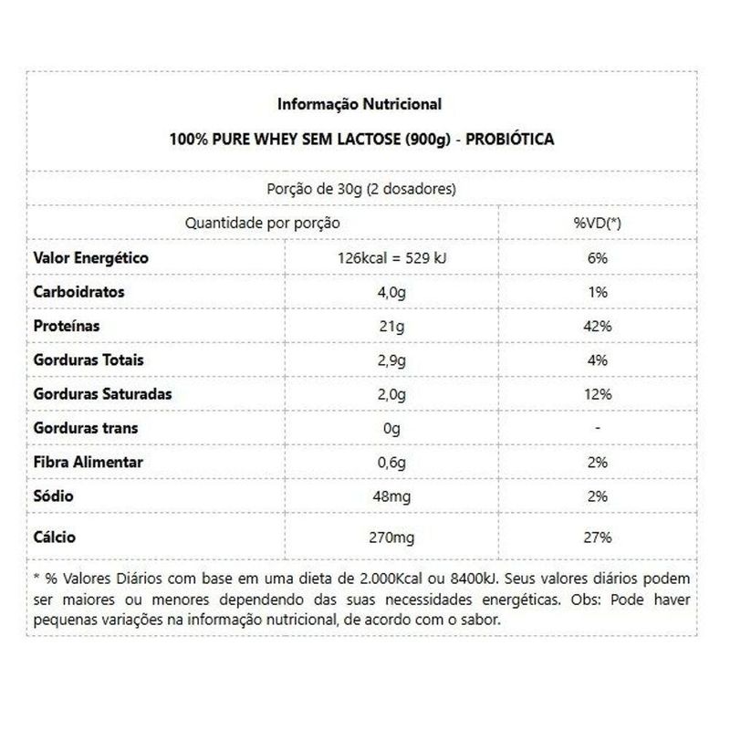 Informação Nutricional 100% PURE WHEY SEM LACTOSE (900g) - PROBIÓTICASabor: ChocolatePorção de 30g (2 dosadores)Quantidade por porção%VD(*)Valor Energético126kcal = 529 kJ6%Carboidratos4,0g1%Proteínas21g42%Gorduras Totais2,9g4%Gorduras Saturadas2,0g12%Gorduras trans0g-Fibra Alimentar0,6g2%Sódio48mg2%Cálcio270mg27%* % Valores Diários com base em uma dieta de 2.000Kcal ou 8400kJ. Seus valores diários podem ser maiores ou menores dependendo das suas necessidades energéticas. Obs: Pode haver pequenas variações na informação nutricional, de acordo com o sabor. AMINOGRAMAAminoácidoDOSEAlanina1.062Arginina1.032Ácido Aspártico2.638Ácido Glutâmico4.221Cisteína137Glicina502Histidina439Isoleucina1.576Leucina2.017Lisina2.024Metionina568Fenilalanina689Prolina1.544Serina1.416Treonina1.954Tirosina328Triptofano699Valina1.278 Informação Nutricional 100% PURE WHEY SEM LACTOSE (900g) - PROBIÓTICASabor: MorangoPorção de 30g (2 dosadores)Quantidade por porção%VD(*)Valor Energético124kcal = 521 kJ6%Carboidratos4,0g1%Proteínas22g44%Gorduras Totais2,2g4%Gorduras Saturadas1,6g5%Gorduras trans0g-Fibra Alimentar0g0%Sódio37mg2%Cálcio280mg27%* % Valores Diários com base em uma dieta de 2.000Kcal ou 8400kJ. Seus valores diários podem ser maiores ou menores dependendo das suas necessidades energéticas. Obs: Pode haver pequenas variações na informação nutricional, de acordo com o sabor. AMINOGRAMAAminoácidoDOSEAlanina1.141Arginina1.087Ácido Aspártico2.850Ácido Glutâmico4.525Cisteína144Glicina533Histidina470Isoleucina1.709Leucina2.182Lisina2.190Metionina617Fenilalanina741Prolina1.672Serina1.528Treonina2.121Tirosina354Triptofano752Valina1.381 Informação Nutricional 100% PURE WHEY SEM LACTOSE (900g) - PROBIÓTICASabor: BaunilhaPorção de 30g (2 dosadores)Quantidade por porção%VD(*)Valor Energético124kcal = 521 kJ6%Carboidratos4,0g1%Proteínas22g44%Gorduras Totais2,2g4%Gorduras Saturadas1,6g7%Gorduras trans0g-Fibra Alimentar0g0%Sódio39mg2%Cálcio279mg28%* % Valores Diários com base em uma dieta de 2.000Kcal ou 8400kJ. Seus valores diários podem ser maiores ou menores dependendo das suas necessidades energéticas. Obs: Pode haver pequenas variações na informação nutricional, de acordo com o sabor. AMINOGRAMAAminoácidoDOSEAlanina1.138Arginina1.084Ácido Aspártico2.843Ácido Glutâmico4.514Cisteína144Glicina532Histidina470Isoleucina1.709Leucina2.182Lisina2.190Metionina617Fenilalanina741Prolina1.672Serina1.528Treonina2.121Tirosina354Triptofano750Valina1.377