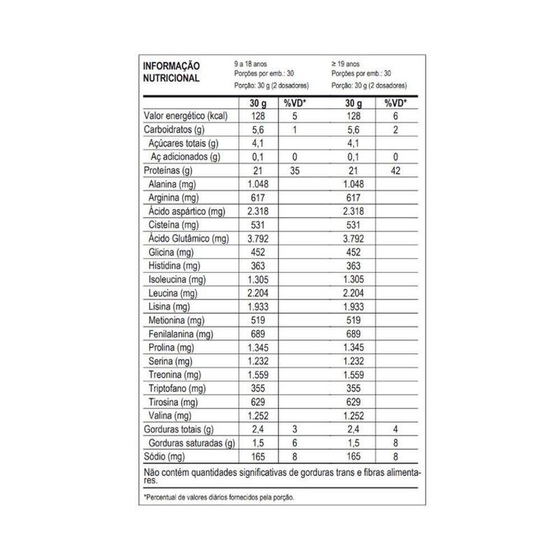 Informação Nutricional 100% Whey (900g) - Max Titanium Porções por embalagem: 23Porção de 40g (2 dosadores)Quantidade por porção%VD(*)Valor energético - kcal1305Carboidratos - g131Açúcares totais - g5,1 Açúcares adicinados - g 0,1 0Proteínas - g 20 35Alanina - mg994 Arginina - mg625 Ácido aspártico - mg2.322 Cisteína - mg535 Ácido Glutâmico - mg3.802 Glicina - mg452 Histidina - mg369 Isoleucina - mg1.315 Leucina - mg2.210 Lisina - mg1.936 Metionina - mg515 Fenilalanina - mg694 Prolina - mg1.348 Serina - mg1.231 Treonina - mg1.560 Triptofano - mg356 Tirosina - mg634 Valina1.262 Gorduras totais - g2,63Gorduras saturadas - g1,66Sódio - mg1059Não contém quantidades significativas de gorduras trans e fibras alimentares. * Percentual de valores diários fornecidos pela porção. Obs: Pode haver pequenas variações na informação nutricional, de acordo com o sabor.