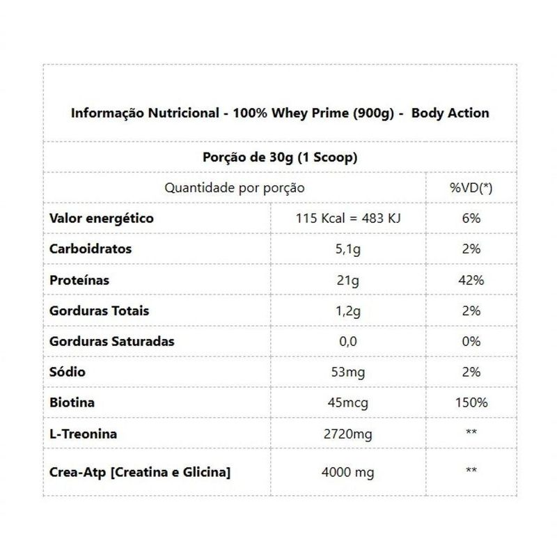 Informação Nutricional 100% Whey Prime (900g) - Ação CorporalPorção de 30g (1 colher)Quantidade por porção%VD(*)Valor energético 115 Kcal = 483 KJ6%Carboidratos5,1g2%Proteínas21g42%Gorduras Totais1,2g2%Gorduras Saturadas0,00%Sódio53mg2%Biotina45mcg150%L-Treonina2720mg**Crea-Atp [Creatina e Glicina]4000mg**Não contém quantidades mínimas de gorduras trans e fibras alimentares.*% Valores Diários com base em uma dieta de 2.000Kcal ou 8400kJ. Seus valores diários podem ser maiores ou menores dependendo de suas necessidades energéticas. Obs: Pode haver pequenas variações na informação nutricional, de acordo com o sabor. AMINOÁCIDOSÁcido Aspártico2200mgÁcido Glutâmico820mgAlanina1035mgArginina561mgCisteína461mgFenilalanina**660mgGlicina****1360mgHistidina**320mgIsoleucina**1054mgLeucina**2.088 mgLisa**560mgMetionina**408mgProlina1201mgSerina961mgTirosina598mgTreonina****4028mgTriptofano**369mgValina**1100mg**Aminoácidos essenciais***Provenientes dos materiais-primas****Provenientes das matérias-primas e adicionais.