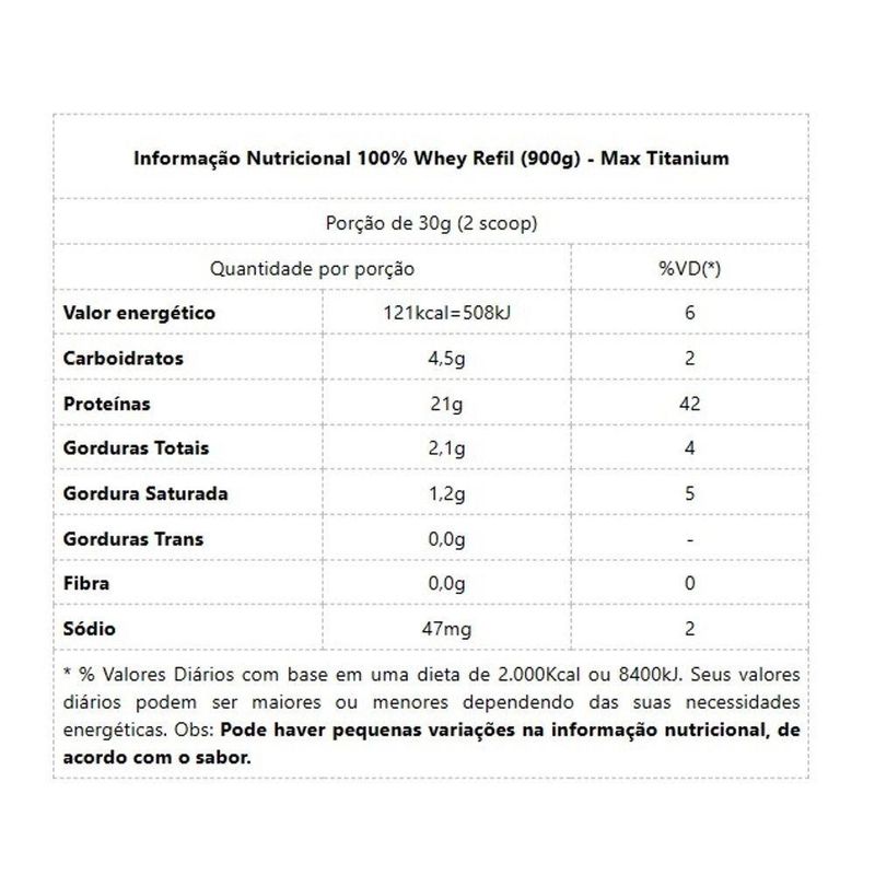 Informação Nutricional 100% Whey (900g) - Max TitaniumPorções por embalagem: 30Porção de 30g (2 dosadores)Quantidade por porção%VD(*)Valor energético - kcal1305Carboidratos - g5,61Açúcares totais - g3,1 Açúcares adicinados - g 0,1 0Proteínas - g 21 35Alanina-MG1.055 Arginina – mg625 Ácido aspártico - mg2.322 Cisteína - mg535 Ácido Glutâmico - mg3.802 Glicina - mg452 Histidina - mg369 Isoleucina – mg1.315 Leucina - mg2.210 Lisina - mg1.936 Metionina – mg515 Fenilalanina – mg694 Prolina - mg1.348 Serina-MG1.231 Treonina - mg1.560 Triptofano - mg356 Tirosina - mg634 Valina1.262 Gorduras totais - g2,63Gorduras saturadas - g1,66Sódio-MG1849Não contém mínimos de gorduras trans e fibras alimentares. * Percentual de valores diários fornecidos por porção. Obs: Pode haver pequenas variações na informação nutricional, de acordo com o sabor.