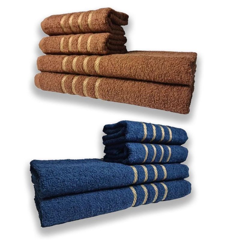 RESUMO T?CNICO DO?2 JOGOS COM 4 TOALHAS Montreal?Composi??o - 4 Toalhas de Banho + 4 Toalhas de RostoGramatura - 330 G/m??Peso Toalha de Banho - 290 a 300 Gramas?Peso Toalha de Rosto - 110 a 120 GramassTamanho Toalha de Banho - 70x130 cm?Tamanho Toalha de Rosto - 45x70 cm?Fio - 16/1QUALIDADE?DO KIT COM?8 TOALHAS Montreal?As?Toalhas Montreal s?o confeccionadas com 100% algod?o, tendo alta absor??o de ?gua desde a primeira vez de uso. S?o indicadas para uso no Dia a Dia, Pousada, Est?tica, Praia, Spas, Hoteis e Moteis. Feito com fio 16/1 singelo um dos melhores fios para produ??o de toalhas tornando-as mais macias e com alta durabilidade nas lavagens industriais.O tingimento ? reativo deixando a?Toalha Montreal com cores modernas e vivas, por ser reativo n?o tem o risco de soltar tinta. Essa toalha cont?m a barra decorada em?dourado para dar um toque de modernidade e luxo ao seu Ambiente.