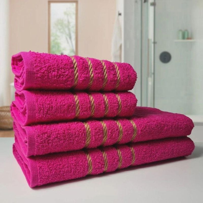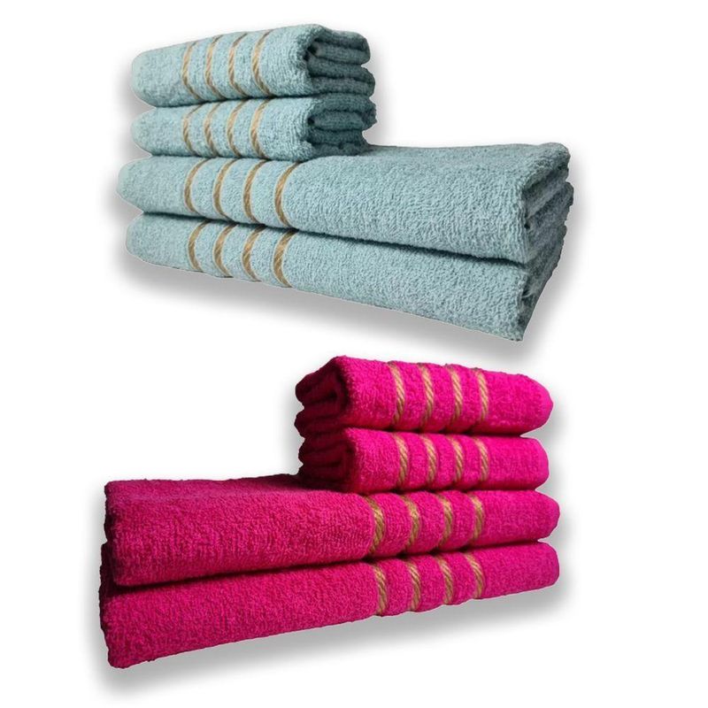 RESUMO T?CNICO DO?2 JOGOS COM 4 TOALHAS Montreal?Composi??o - 4 Toalhas de Banho + 4 Toalhas de RostoGramatura - 330 G/m??Peso Toalha de Banho - 290 a 300 Gramas?Peso Toalha de Rosto - 110 a 120 GramassTamanho Toalha de Banho - 70x130 cm?Tamanho Toalha de Rosto - 45x70 cm?Fio - 16/1QUALIDADE?DO KIT COM?8 TOALHAS Montreal?As?Toalhas Montreal s?o confeccionadas com 100% algod?o, tendo alta absor??o de ?gua desde a primeira vez de uso. S?o indicadas para uso no Dia a Dia, Pousada, Est?tica, Praia, Spas, Hoteis e Moteis. Feito com fio 16/1 singelo um dos melhores fios para produ??o de toalhas tornando-as mais macias e com alta durabilidade nas lavagens industriais.O tingimento ? reativo deixando a?Toalha Montreal com cores modernas e vivas, por ser reativo n?o tem o risco de soltar tinta. Essa toalha cont?m a barra decorada em?dourado para dar um toque de modernidade e luxo ao seu Ambiente.