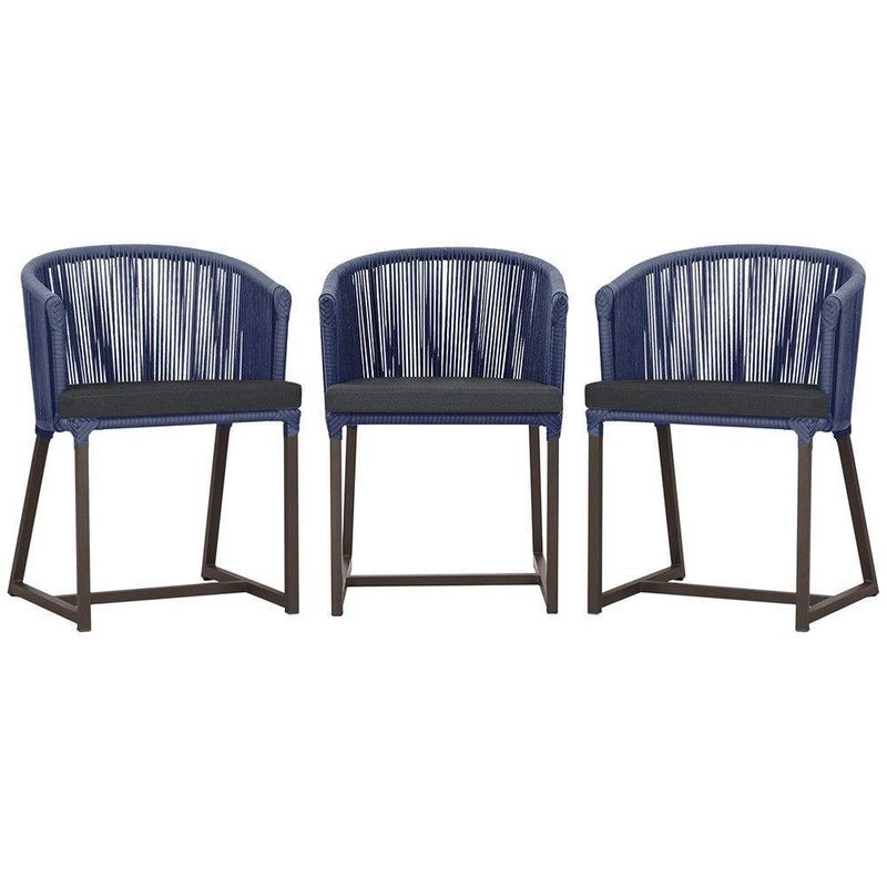 3 Cadeiras De Jantar Noronha Marrom Corda Náutica E11 Trama Azul