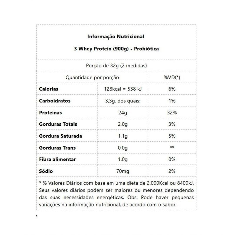 Informação Nutricional 3 Whey Protein (900g) - ProbióticaPorção de 32g (2 medidas)Quantidade por porção%VD(*)Calorias 128kcal = 538 kJ6%Carboidratos3,3g, dos quais:1%Proteínas24g32%Gorduras Totais2,0g3%Gordura Saturada1,1g5%Gorduras Trans0,0g**Fibra alimentar1,0g0%Sódio70mg2%* % Valores Diários com base em uma dieta de 2.000Kcal ou 8400kJ. Seus valores diários podem ser maiores ou menores dependendo das suas necessidades energéticas. Obs: Pode haver pequenas variações na informação nutricional, de acordo com o sabor. AMINOGRAMAALANINA1104mg ARGININA667mg ÁCIDO ASPÁRTICO2219mg CISTEÍNA1390mg ÁCIDO GLUTÂMICO4084mg GLICINA481mg HISTIDINA578mg ISOLEUCINA1322mg LEUCINA2555mg LISINA2706mg METIONINA451mg FENILALANINA779mg PROLINA817mg SERINA1323mg TRONINA1678mg TRIPTOFANO320mg TIROSINA703mg VALINA1458mg