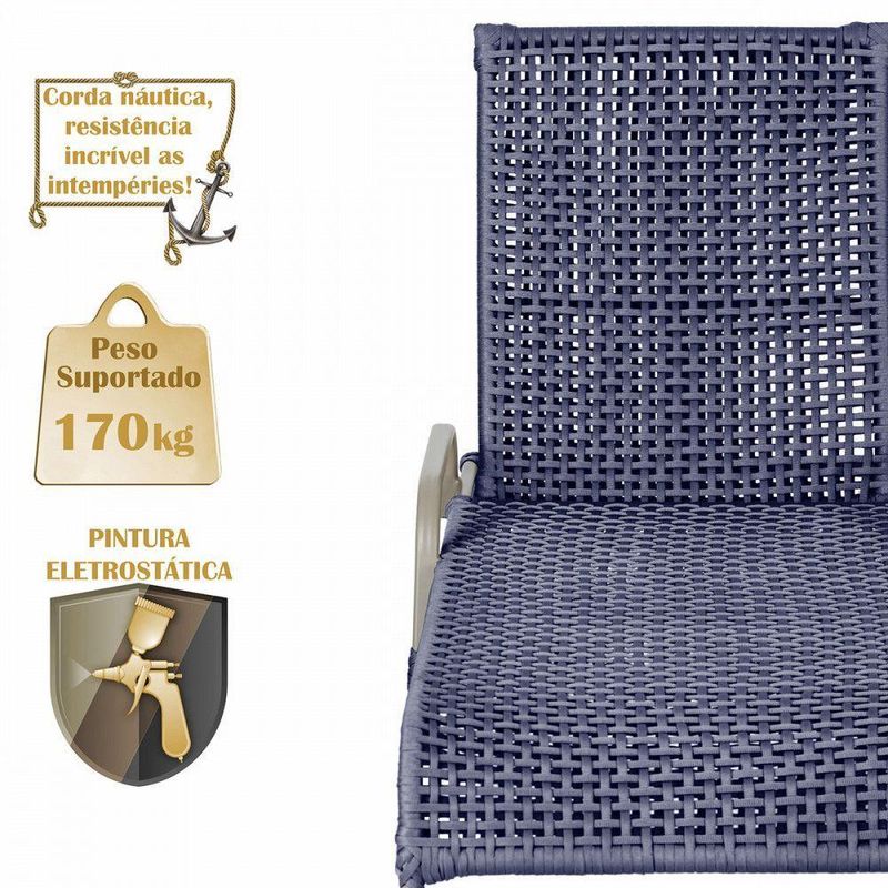 Produto conhecido como: Espreguicadeira reclinavel, Espreguicadeira em aluminio, Espreguicadeira com encosto ajustavel, Espreguicadeira para area externa, Espreguicadeira para piscina, Espreguicadeira resistente ao tempo, Espreguicadeira moderna, Espreguicadeira confortavel, Moveis para area externa, Moveis de aluminio para jardim, Corda nautica para moveis, Espreguicadeira leve e duravel, Design sofisticado para areas externas, Decoracao para varanda e piscina, Espreguicadeira resistente ao sol e chuva