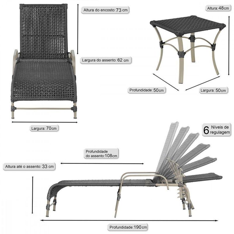 4 Espreguiçadeiras Catar 4 Mesas Garden Corda Náutica Trama Preto
