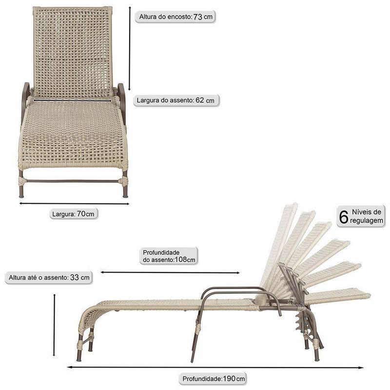 Produto conhecido como: Espreguicadeira reclinavel, Espreguicadeira em aluminio, Espreguicadeira com encosto ajustavel, Espreguicadeira para area externa, Espreguicadeira para piscina, Espreguicadeira resistente ao tempo, Espreguicadeira moderna, Espreguicadeira confortavel, Moveis para area externa, Moveis de aluminio para jardim, Corda nautica para moveis, Espreguicadeira leve e duravel, Design sofisticado para areas externas, Decoracao para varanda e piscina, Espreguicadeira resistente ao sol e chuva.