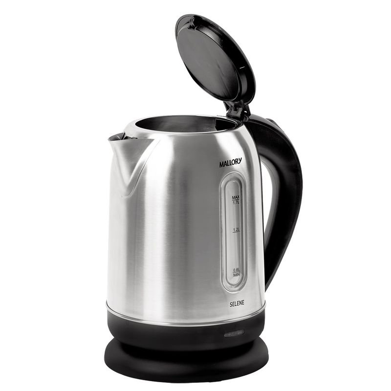 A Chaleira SELENE da Mallory possui corpo em aço inoxidável, indicadores de nível de água nos dois lados com iluminação, capacidade máxima de 1,7L e resistência oculta.
