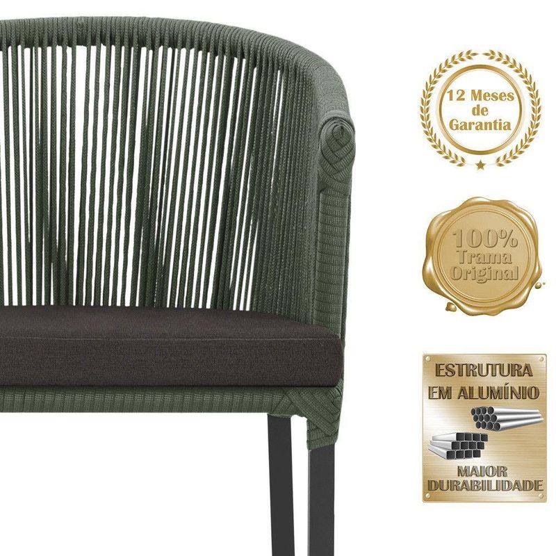 Combinando estilo e resistencia, esta cadeira traz o melhor do design contemporaneo em aluminio com micro pintura e acabamento em corda nautica. O estofado impermeavel completa o conforto e a funcionalidade, tornando-a ideal para ambientes externos e internos.