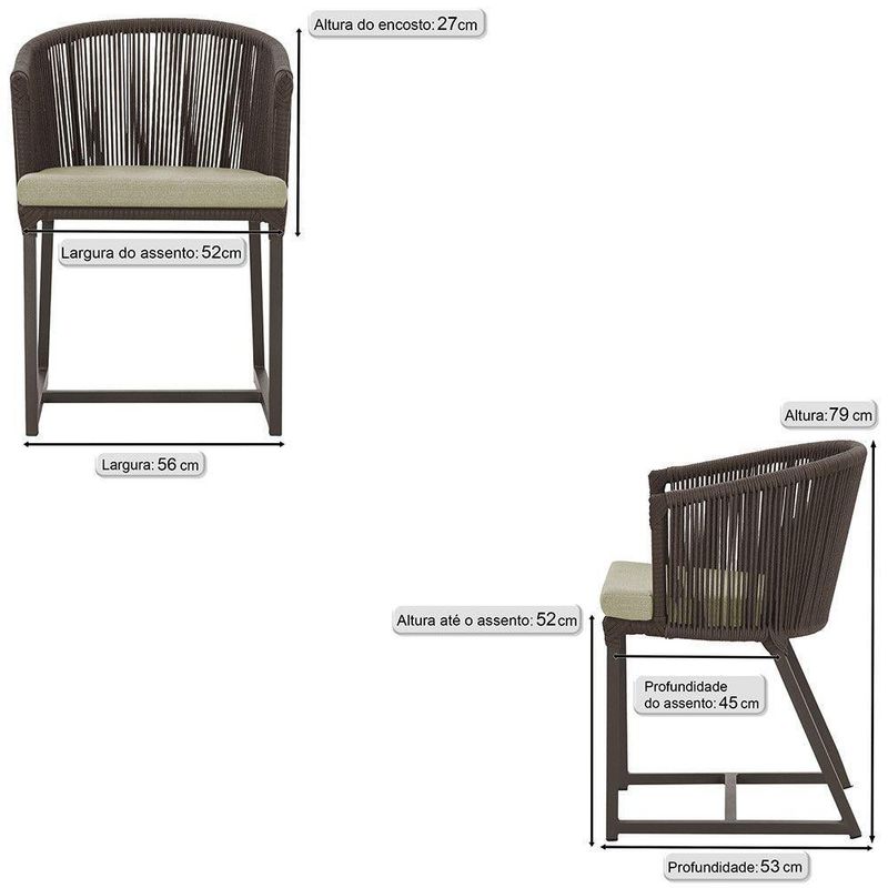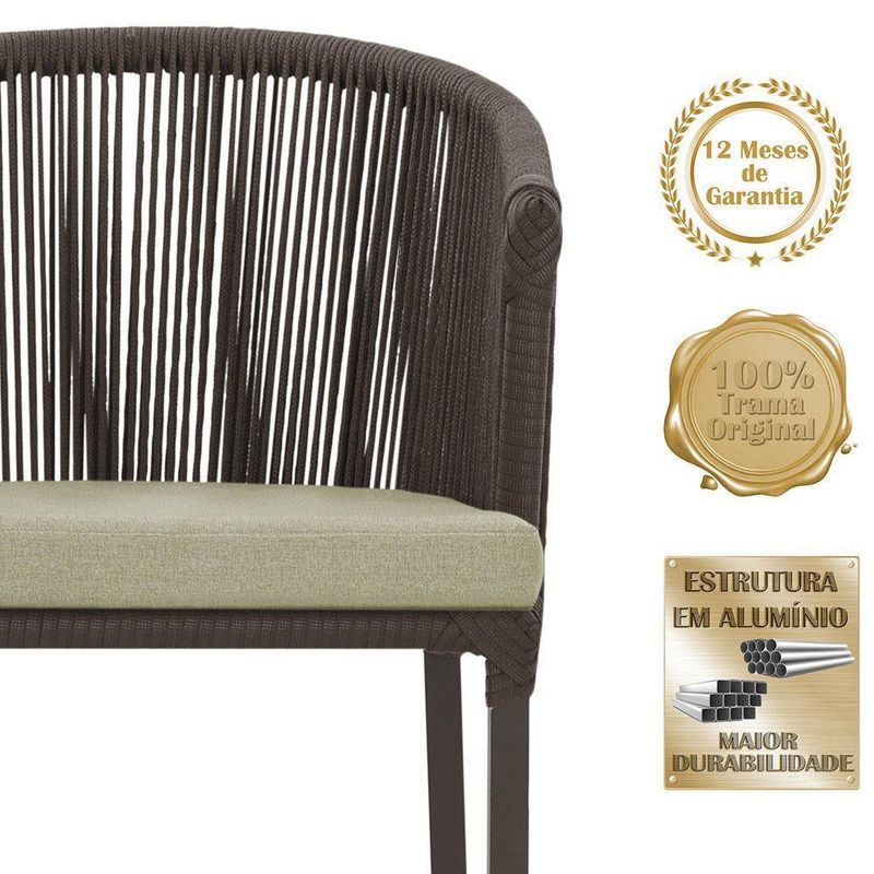 Combinando estilo e resistencia, esta cadeira traz o melhor do design contemporaneo em aluminio com micro pintura e acabamento em corda nautica. O estofado impermeavel completa o conforto e a funcionalidade, tornando-a ideal para ambientes externos e internos.