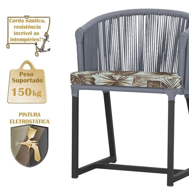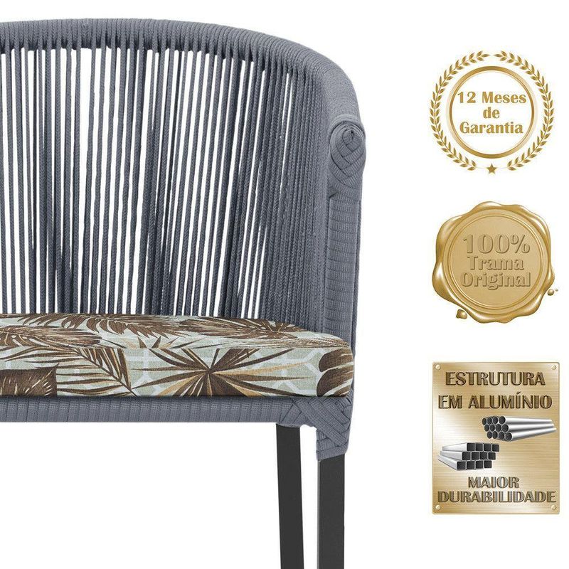 Combinando estilo e resistencia, esta cadeira traz o melhor do design contemporaneo em aluminio com micro pintura e acabamento em corda nautica. O estofado impermeavel completa o conforto e a funcionalidade, tornando-a ideal para ambientes externos e internos.