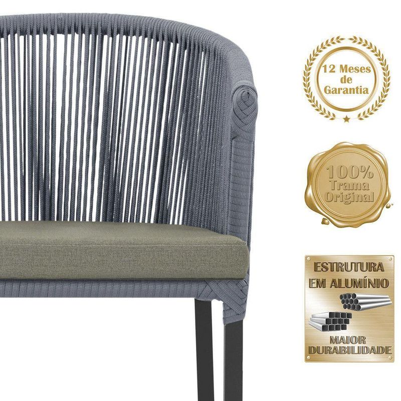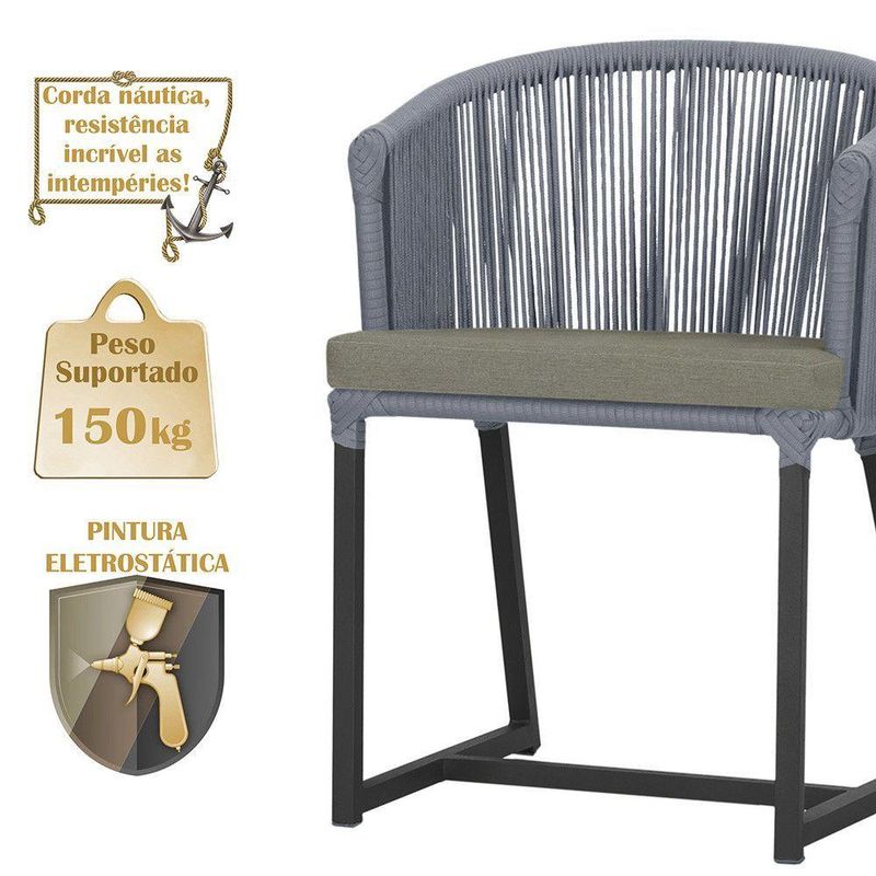 Combinando estilo e resistencia, esta cadeira traz o melhor do design contemporaneo em aluminio com micro pintura e acabamento em corda nautica. O estofado impermeavel completa o conforto e a funcionalidade, tornando-a ideal para ambientes externos e internos.