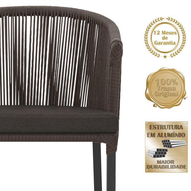 Combinando estilo e resistencia, esta cadeira traz o melhor do design contemporaneo em aluminio com micro pintura e acabamento em corda nautica. O estofado impermeavel completa o conforto e a funcionalidade, tornando-a ideal para ambientes externos e internos.