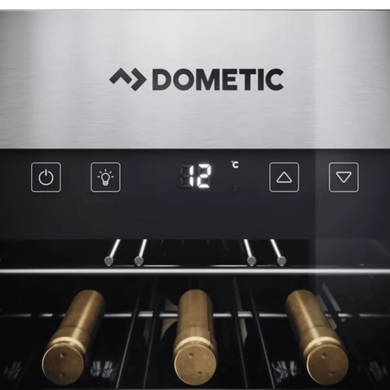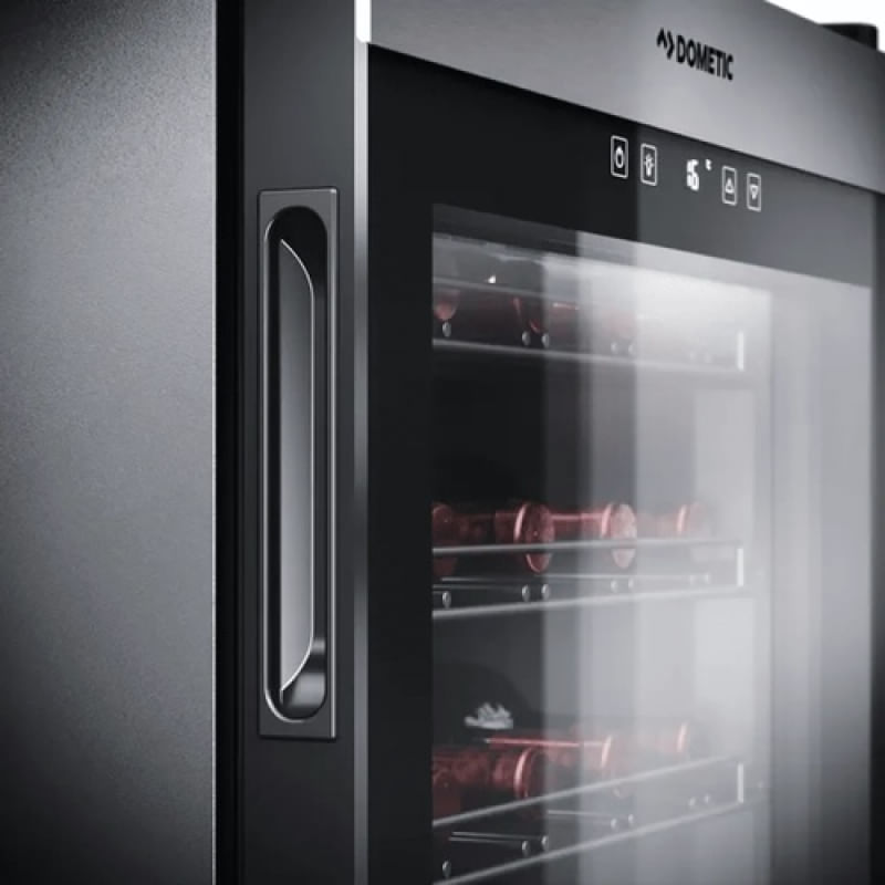 Adega Dometic, proporciona o ambiente ideal para a preservação e maturação do vinho. Com capacidade para 55 garrafas, exibidas de forma atraente atrás de uma porta de vidro resistente aos raios UV de tripla camada e iluminadas suavemente por uma luz interior branca. Uma