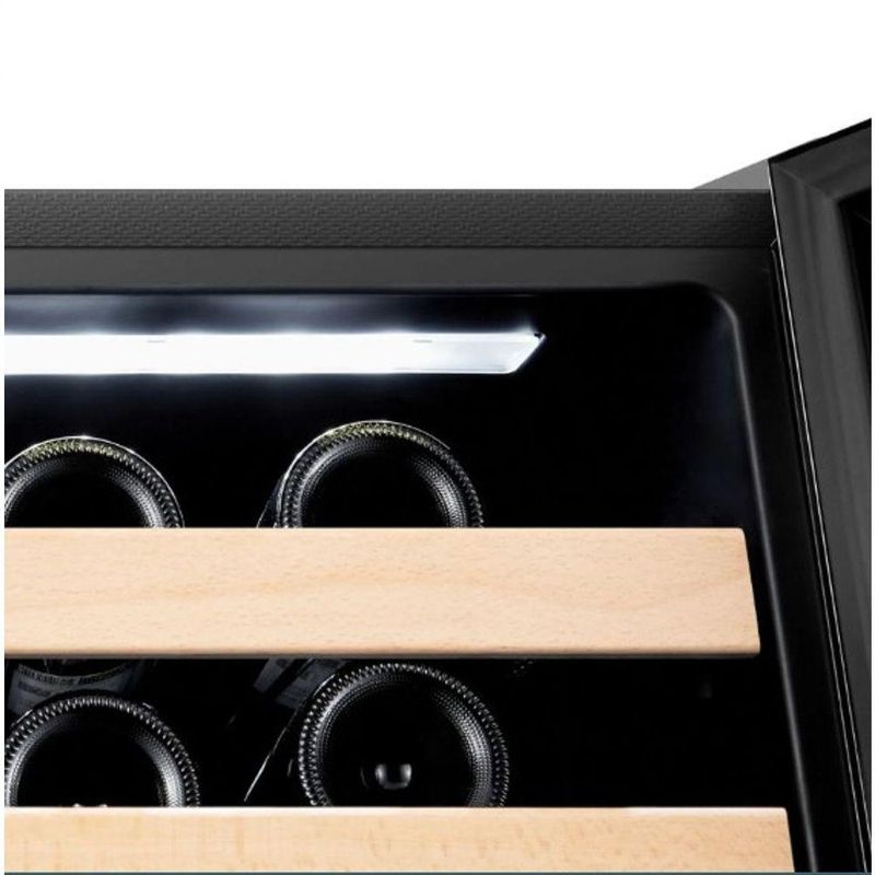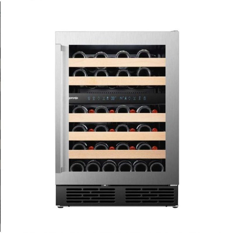 2023!Precisão e rigorosos processos de fabricação fazem da Adega Dual Zone da Gorenje um produto a frente de seu tempo. Para clientes que buscam sofisticação, tecnologia de ponta e funcionalidade. Tenha seus varietais armazenados no ambiente que eles merecem.Adega Dual Zone ou 2 zonas: Você pode armazenar diferentes tipos de vinho em zonas distintas e independentes. Suas dimensões permitem que o produto seja embutido embaixo de uma bancada ou tampo seguindo o conceito de equipamentos Under Counter. Você pode compor com o Frigobar/ beverage cooler, fazendo uma composição de extrema elegância e funcionalidade.Adega com 138 Litros de capacidade interna para armazenar até 46 garrafas padrão Bordalesa 750ml5 prateleiras metálicas com acabamento frontal em madeira com guias telescópicas com projeção de 40 cm e 8 posições cada em + compartimento inferior com capacidade para 6 garrafas2 zonas de armazenamento independentes: A de temperatura varia entre 5°C e 18°C. A temperatura predefinida na é de 12°CAcabamento frontal com moldura em aço sem emendas e puxador quadrado-plano em aço inoxidávelPorta com vidro duplo Anti UV escurecido para proteger o vinho da luz no caso da adega estar localizada em muito iluminadoControle digital interno por toque, posicionado no centro e visível através da portaModo Standby: Quando o aparelho não estiver em uso, ou desabastecido, por um período de tempo, pode-se economizar energia colocando o aparelho no estado de standbyAlarme de sobreaquecimento: Para evitar um de temperatura elevada, que poderia afetar a qualidade do vinho, o aparelho tem uma função de alarme sonoro de sobreaquecimentoAlarme de porta aberta soará uma vez se a porta estiver aberta por mais de 2 minutosIluminação interna na parte superior em LED AZUL. suave e uniforme, sem gerar aquecimento2 Escalas Termométricas: Fahrenheit °F e Celsius °C2 Circuladores de ar internos, para distribuir e manter a temperatura uniforme e constante no interior dos compartimentosSistema de refrigeração NO FROST: Sistema de degelo automático onde não se faz necessário sua intervenção para descongelar a adegaNa parte frontal o aparelho está equipado com dois pés reguláveis para pequeno ajuste de altura e nivelamento do aparelhoCompõe com o Frigobar/Beverage Cooler fazendo uma composição perfeita de extrema elegância e funcionalidadeProduto certificado no INMETROEspecificações Técnicas: