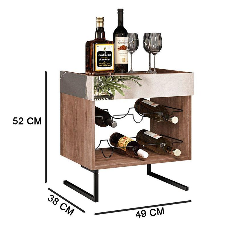Estrutura: MDP 15 mm; Acabamento:Pintura BP; Estrutura da Base: Metal antioxidante com pintura eletroestática; Cor:Demolição; Suporte Metálico: Espaço para seis garrafas; Montagem: O produto vai desmontado, recomendamos a contratação de um profissional; Instruções de Limpeza: Utilizar um pano limpo e levemente úmido Você irá receber: 02 Volumes; Observações Relevantes