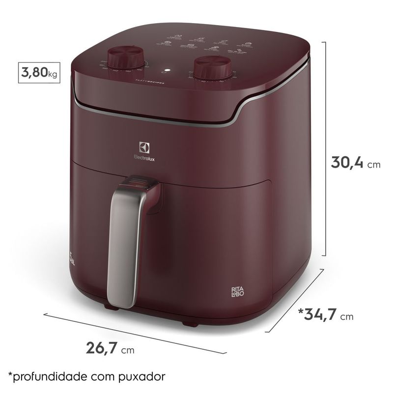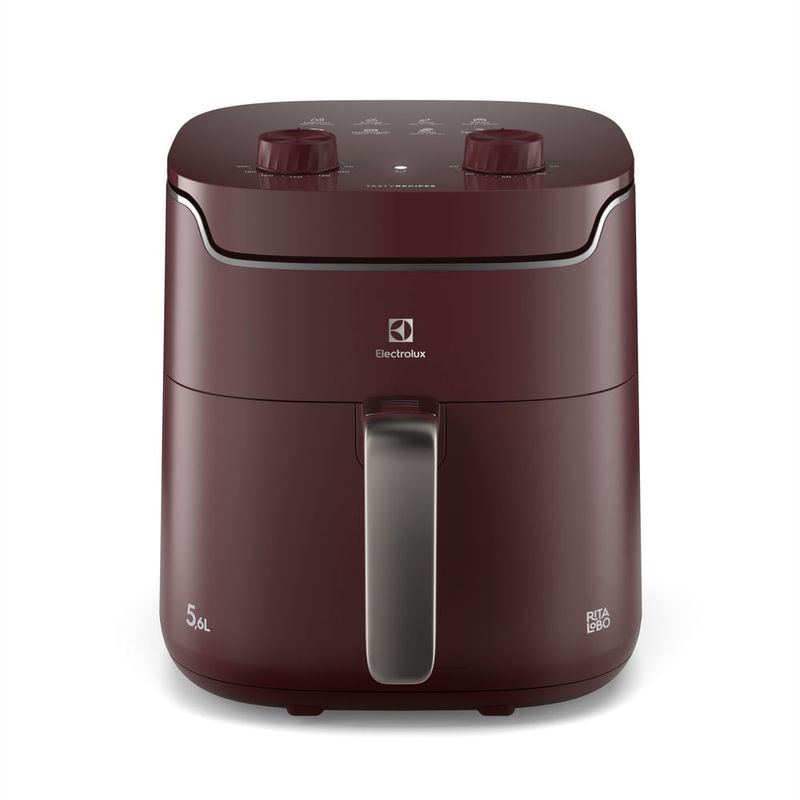 A Air Fryer Electrolux por Rita Lobo (EAF41) possui capacidade total de 5,6L, com cesto interno removível de 4L e dupla camada antiaderente, facilitando a limpeza e a remoção dos alimentos.