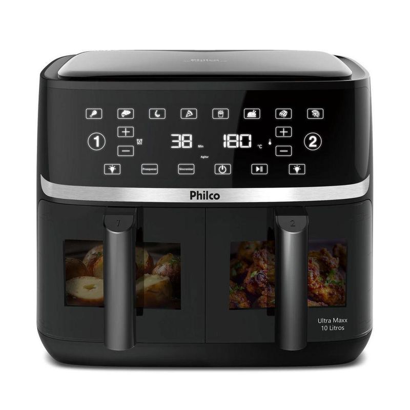 A Air Fryer Philco 10L Cesto Duplo PAF10A é a aliada perfeita para quem ama cozinhar de forma saudável e prática. Com seus 2 cestos de 5L, você prepara duas receitas diferentes ao mesmo tempo, com temperaturas e tempos personalizados, economizando tempo e energia.Os 2000W de potência da Air Fryer Philco garantem que seus alimentos fiquem prontos rapidamente e com a textura perfeita. O painel touch digital com 8 funções pré-programadas facilita o preparo de diversas receitas, desde frituras até desidratação.Com a função sincronizar, você pode preparar duas porções iguais de um mesmo alimento, com a mesma temperatura e tempo. O visor de vidro da Air Fryer com luzes internas permite acompanhar de perto o cozimento dos seus alimentos.Versátil e eficiente, a Air Fryer Philco PAF10A é 4 em 1: frita sem óleo, assa, reaquece e desidrata, oferecendo mais possibilidades para sua cozinha. Cozinhe com mais saúde e sabor, sem abrir mão da praticidade!Principais Características:- Frita com pouquíssimo ou nenhum óleo