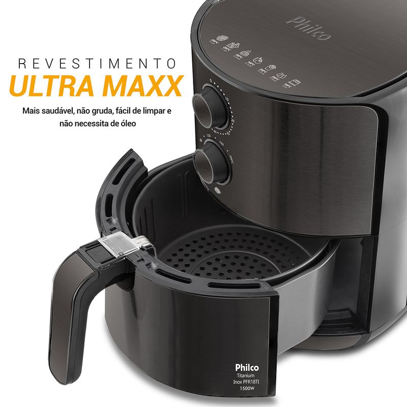 Prepare frango, batata, bolinho e até mesmo pudim! Desfrute de toda praticidade da Fritadeira Air Fryer Philco PFR18TI Titanium Inox 4,6L 1500W para preparar as mais variadas receitas em instantes. Prepare-se para conhecer o seu melhor amigo dentro da cozinha! Mais tempo para você! Configure o preparo e a função timer, com desligamento automático, e cuide de outros afazeres enquanto a Air Fryer Philco faz o resto. Ideal para várias receitas Controle de temperatura de 80 a 200 graus. Alta performance no seu dia a dia 1500W de potência. Sem óleo. Sem grudar. Mais saúde. Antiaderente Ultra Maxx. Cesto limpa fácil Cesto lavável na mão ou na máquina de lavar louças Design moderno Acabamento em inox cor Titanium.