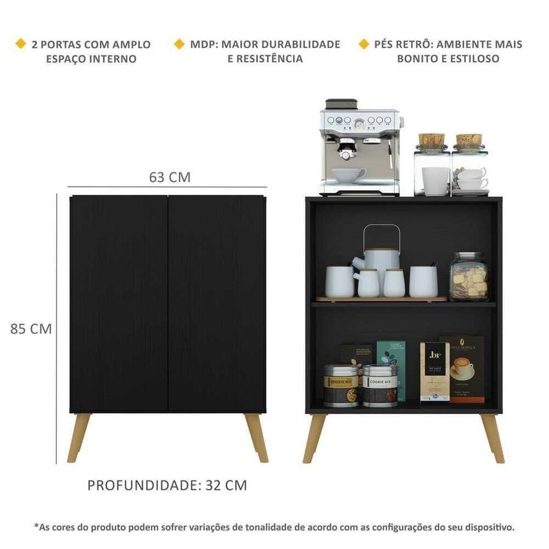 O Aparador Buffet 2 Portas Retrô Veneza Multimóveis é produzido em MDP com acabamento acetinado (cerca de 20% de brilho), que garante maior durabilidade, facilidade na limpeza, além de um acabamento superior. Com 2 portas, possui um excelente espaço interno para organizar louças, bebidas e demais objetos (a prateleira interna suporta 8 Kg e o tampo 9 Kg). Os pés retrô, em polipropileno, dão um charme especial ao móvel deixando-o com um visual leve e permitindo você compor um ambiente com ar vintage e moderno ao mesmo tempo. Os amantes de café poderão deixar seu cantinho mais charmoso e prático para curtir os melhores momentos com os amigos e família, saboreando um delicioso cafezinho.