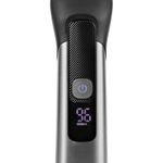 Com corpo à prova d’água (IPX7), MaxGroom pode ser usado no banho, na pia ou onde você achar mais conveniente, sem riscos. Seu display em LED oferece controle total, indicando a carga da bateria e o status da trava de segurança.
