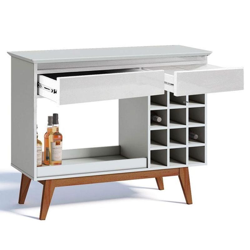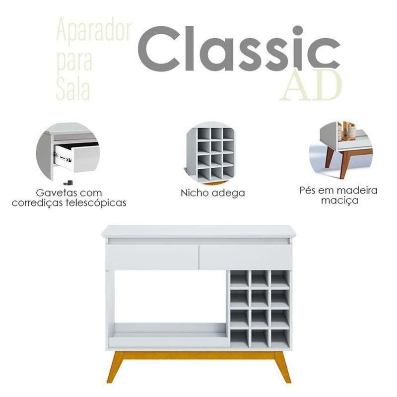 Aparador para Sala Ambiente Classic AD Branco Acetinado - ImcalO aparador da linha Classic AD combina funcionalidade e elegância para complementar seu ambiente. Suas duas gavetas são equipadas com corrediças telescópicas, possuindo uma abertura suave e sem esforço. As gavetas oferecem um ótimo espaço interno para organizar diversos itens, mantendo seu espaço sempre organizado e arrumado. Além disso, apresenta nicho adega para até doze garrafas, permitindo que você exiba sua coleção de forma elegante e acessível. Os pés em madeira maciça garante estabilidade dando um charme rústico. Fabricado pela Imcal, foi desenvolvido em MDP/ MDF com materiais de alta qualidade garantindo mais durabilidade e prolongando a vida útil. Com acabamento impecável será a peça que combina beleza e praticidade para sua sala de estar. Confira e garanta o seu!Características técnicas:- Produzido em MDP/ MDF