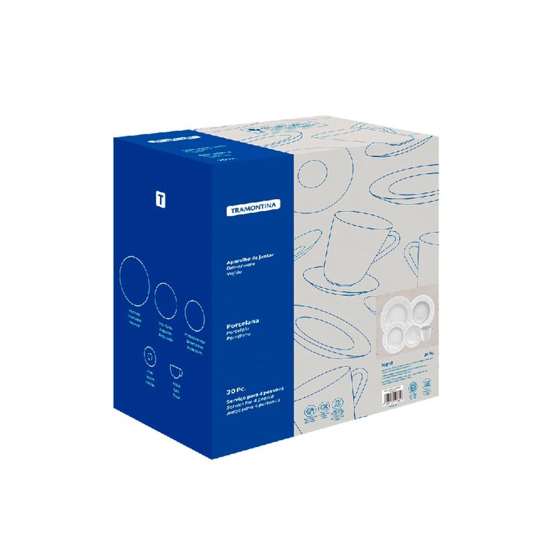 Fabricado em porcelana tradicional de alta qualidade, este aparelho de jantar é composto por 20 peças: 4 pires, 4 xícaras de chá com capacidade de 185ml, 4 pratos fundos de 23cm, 4 pratos rasos de 27cm e 4 pratos de sobremesa de 21cm.