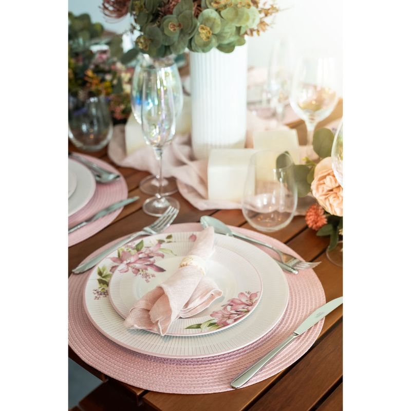 O aparelho de jantar Tramontina em porcelana 30 peças da coleção Poème serve até 6 pessoas, com um design encantador que mistura tons suaves de rosa e detalhes florais. Perfeito para ocasiões especiais, oferece elegância e praticidade, sendo compatível com micro-ondas e lava-louças.