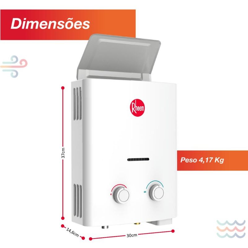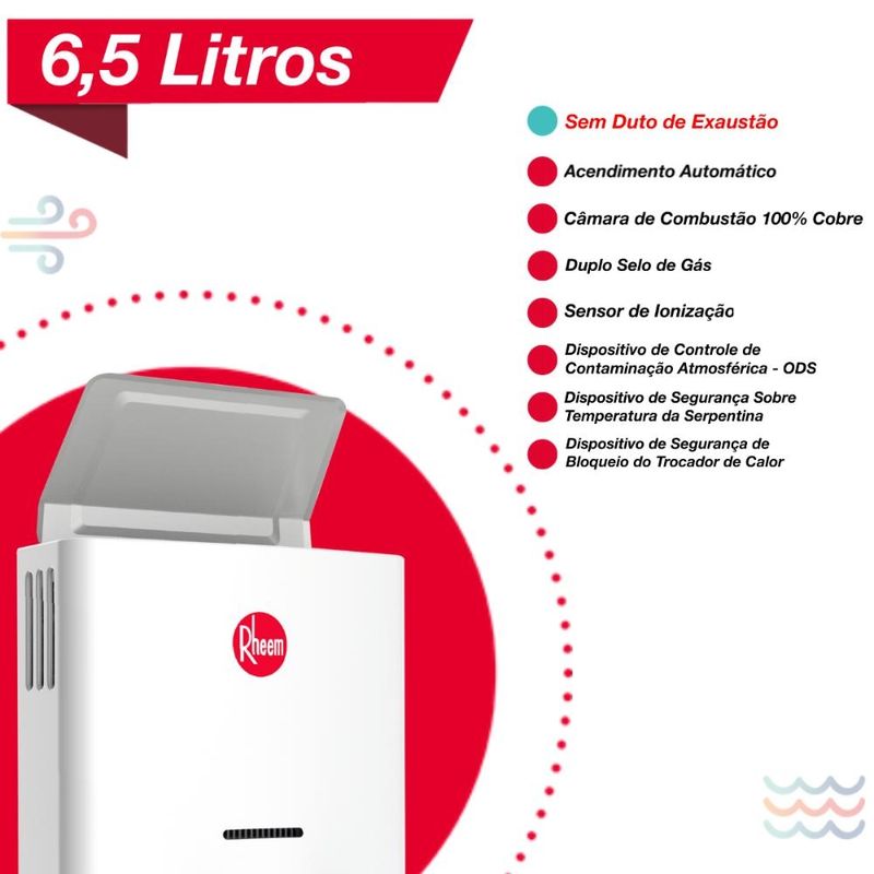 O aquecedor Rheem 6,5 litros foi desenvolvido com tecnologia que dispensa o uso de duto de exaustão, permitindo instalação sem chaminé, ideal para ambientes sem exaustão externa. Equipado com sensor de segurança atmosférica (ODS), monitora o ambiente e interrompe o funcionamento em condições inadequadas.Com acendimento automático por pilhas, fornece água quente instantânea, sem reservatório. Seu design compacto facilita a instalação em residências e espaços reduzidos, oferecendo conforto, segurança e a qualidade Rheem, referência mundial em aquecimento de água.