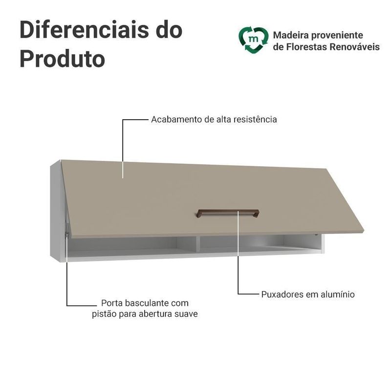 A porta basculante conta com sistema de pistão a gás, que a mantém suspensa quando está aberta, garantindo mais segurança e praticidade. É a solução ideal para manter tudo ao alcance das mãos.