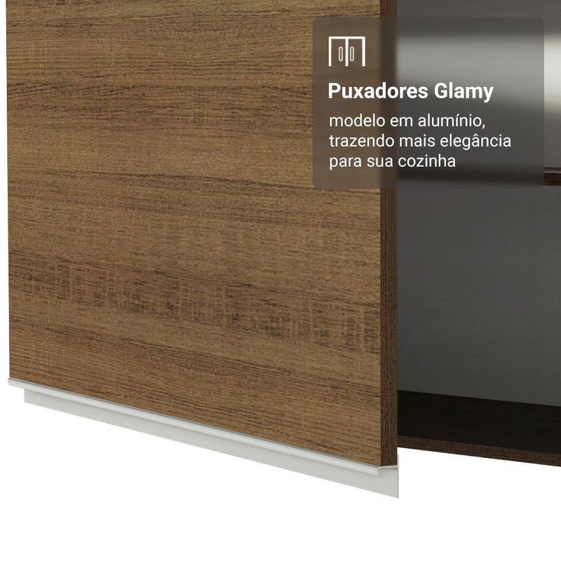 O acabamento da estrutura e das portas é no tom amadeirado Rustic, ideal para quem busca um visual acolhedor e elegante na cozinha. A Linha Glamy combina beleza, qualidade e praticidade, permitindo criar uma cozinha moderna, funcional e cheia de personalidade.