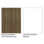 Para completar, o acabamento da cozinha é no padrão amadeirado Rustic e as portas e frentes são brancas. Feito em Pintura Poliéster ecológica, que consiste na aplicação de 7 camadas de proteção resistentes a álcool, água e calor.