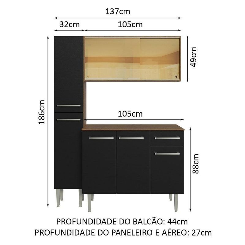- 44 cm de profundidade no balcão e 27 cm de profundidade no aéreo e no paneleiro
