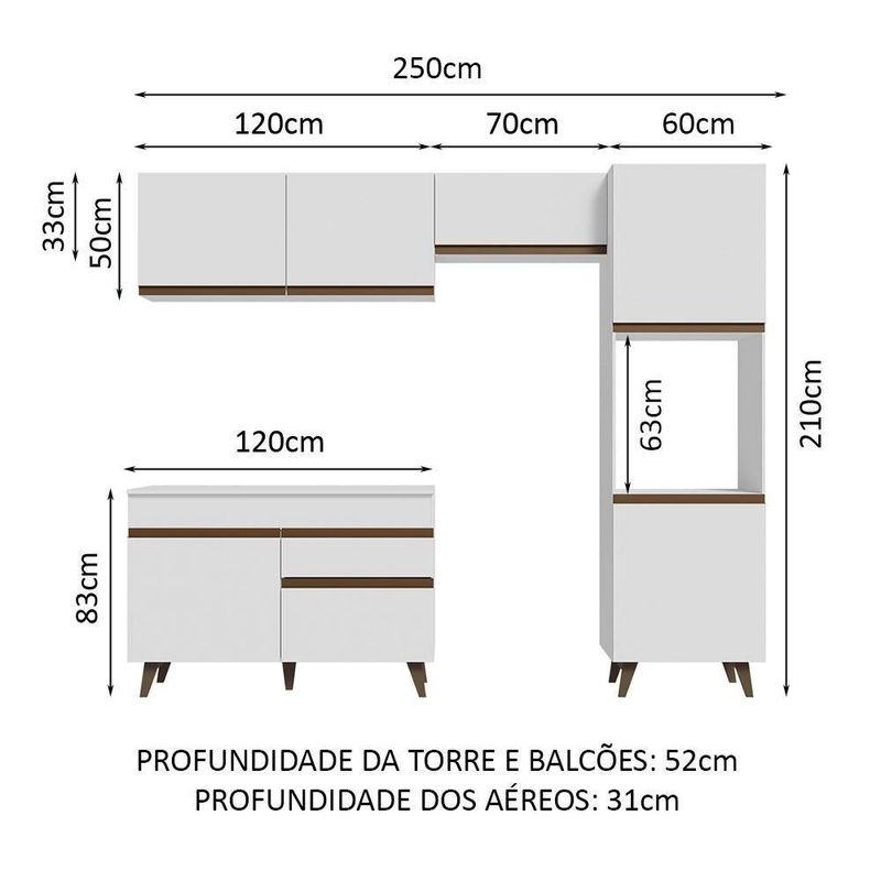 - 52 cm de profundidade no balcão e na torre e 31 cm nos aéreos