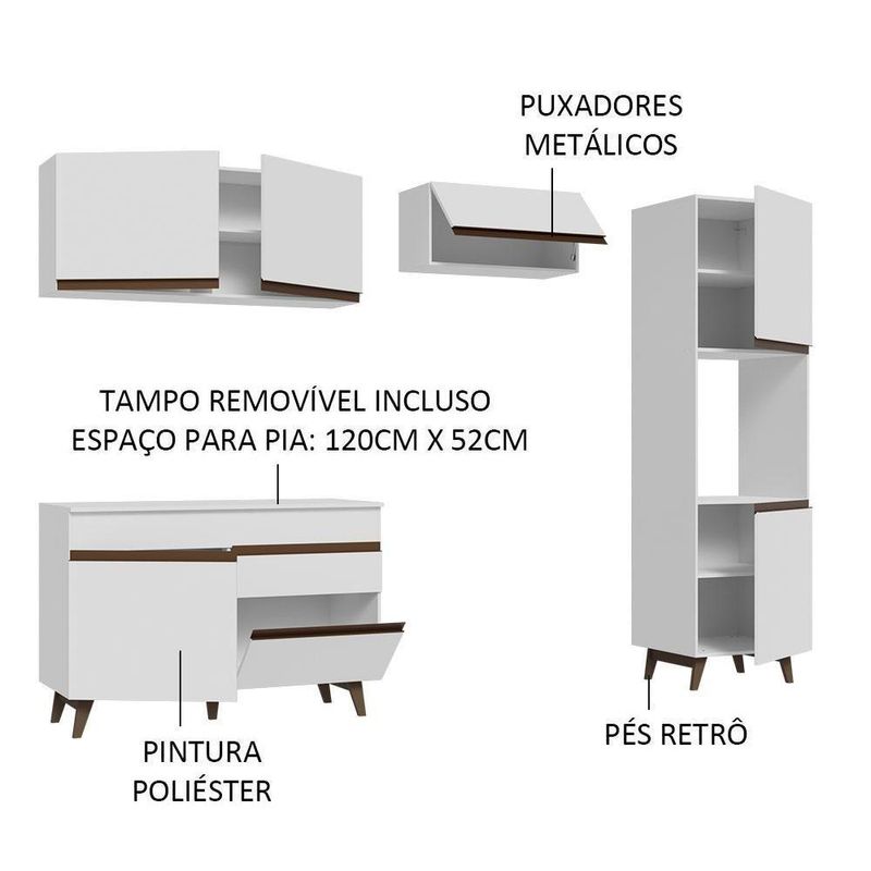 Espaço não vai faltar, pois esta modulação possui balcão, torre e armários aéreos, que oferecem lugar de sobra para a organização de panelas, utensílios, louças, forno, micro-ondas e o que mais você preferir.