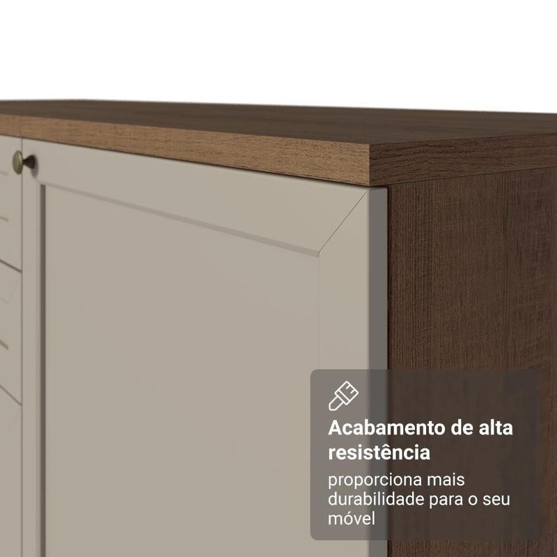 O acabamento de alta resistência da estrutura é no tom rustic, das frentes no tom crema e possui uma textura suave ao toque. O destaque fica por conta dos puxadores ponto e do detalhe das portas.