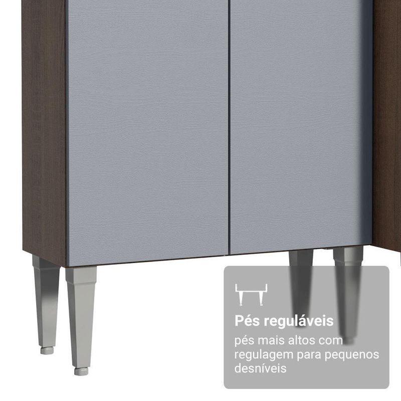 A linha Emilly se destaca pelo acabamento de alta resistência, puxadores em alumínio, corrediças e dobradiças metálicas, garantindo durabilidade no uso diário. Os pés reguláveis proporcionam estabilidade e facilitam a limpeza. O tom amadeirado Rustic com as frentes em Cinza traz um toque moderno para qualquer ambiente.