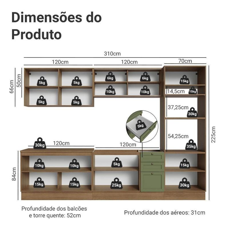 Profundidade: 52 cm (módulos inferiores) 31 cm (aéreos)