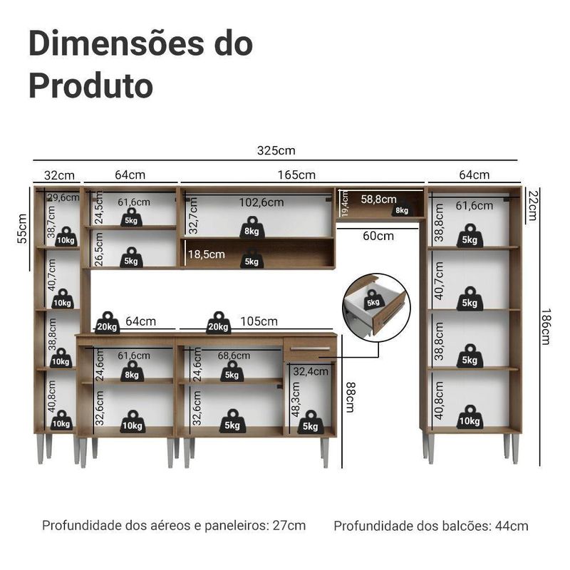- 44 cm de profundidade nos balcões e 27cm nos aéreos/paneleiro