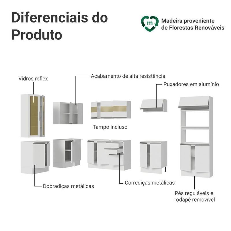 Fabricada em 100% MDF, a linha Smart garante durabilidade e alta resistência. Toda a cozinha é em branco, proporcionando um visual clean e elegante. A cristaleira e o aéreo possuem portas em vidro reflex, que agrega sofisticação e modernidade ao ambiente.