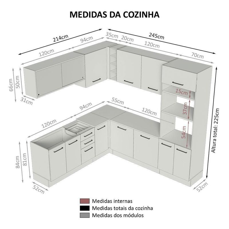- 52 cm nos módulos inferiores e 31 cm nos aéreos