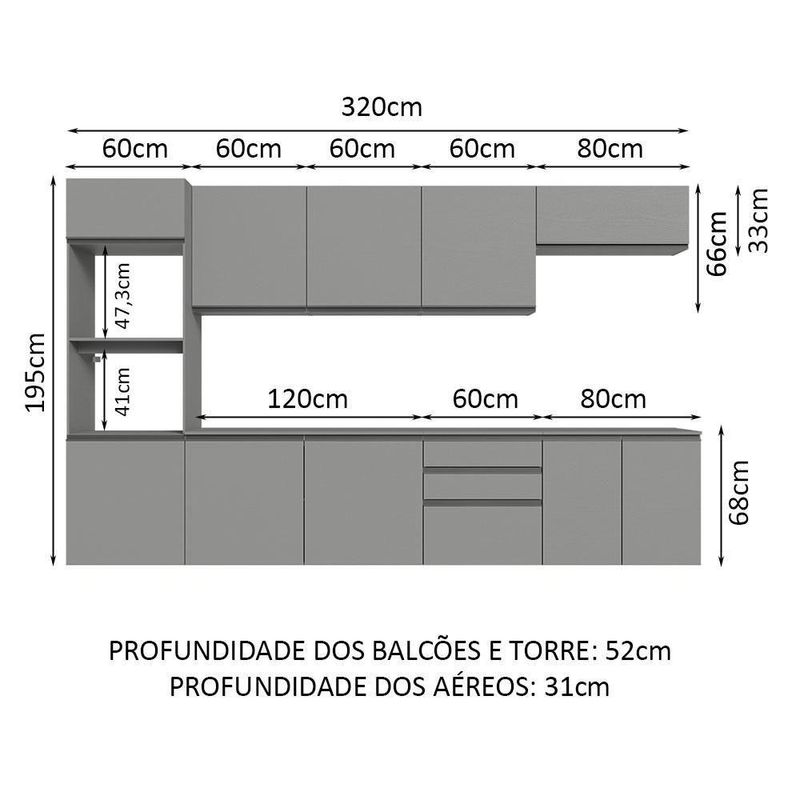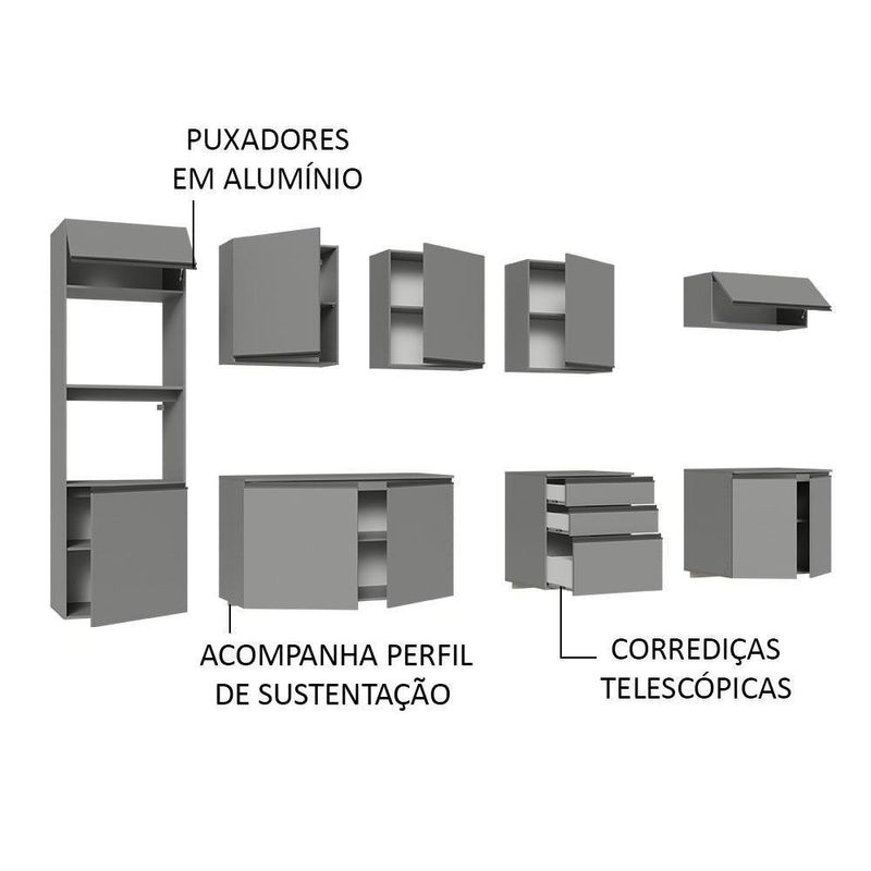 Armário De Cozinha Completa Suspenso 320cm Cinza Nice Madesa 07 Cinza