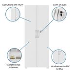 A Esplanada Móveis se responsabiliza pela dos produtos adquiridos até a porta de entrada ou portaria do indicado, se a portaria do condomínio permitir, as são efetuadas no piso térreo e é de responsabilidade do cliente a locomoção da mercadoria até seu apartamento ou casa. MODELO: Armário Multiuso Chicago | MARCA: Notavel | MEDIDAS: [ A ] = 186 cm [ L ] = 61 cm [ P ] = 37,30 cm | COR: Branco | MATERIAL: MDP, produzido a partir de madeira reflorestada | PINTURA: UV (Ultravioleta) | ACABAMENTO: Fosco | PORTA: 2 | TIPO DE PORTA: Articulada | PRATELEIRA: 4 | PESO SUPORTADO POR PRATELEIRA: 5kg | PÉS: 4 | MATERIAL DOS PÉS: Plástico | DIFERENCIAL: Fechadura para armazenar tudo com segurança | PESO DO PRODUTO: 32,90kg | INSTRUÇÕES E CUIDADOS: Não deve ser exposto a água e nem a ambientes umidos. Fazer a limpeza com um pano seco e livre de produtos abrasivos | GARANTIA: 3 meses | OBS: Montagem não inclusa. Entregamos até a porta de entrada da casa do cliente ou até a portaria do condomínio. Cor: Branco
