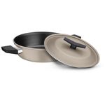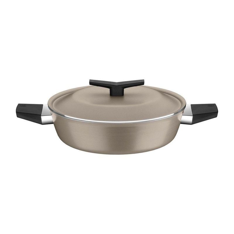 Arrozeira Tramontina Spezia Indução Alumínio Antiaderente Starflon Excellent Areia 24 cmPara preparar arroz de forma prática, a arrozeira Tramontina Spezia Induction em alumínio com revestimento interno e externo em antiaderente Starflon Excellent areia 24 centímetros de diâmetro e 2,5 litros de capacidade é uma escolha excelente. Feita de alumínio com 3 milímetros de espessura, com antiaderente Starflon Excellent, proporciona um cozimento uniforme e praticidade na hora de limpar.Corpo de alumínio com espessura de 3 mm que proporciona cozimento rápido e uniforme.Revestimento interno e externo de antiaderente Starflon Excellent carbono que não gruda, é fácil de limpar, mais durável e não é prejudicial à saúde, pois é livre de PFOA.Cabos e alças de baquelite com acabamento soft-touch: oferecem resistência e conforto.Para maior durabilidade não utilize em máquinas de lavar.Tampa de alumínio: fácil limpeza e leveza no manuseio. Pegador de nylon.Fundo de indução: mais segurança e rapidez no cozimento!Contato indutivo 15,0 centímetros.Pode ser utilizada nos fogões: gás, elétrico, vitrocerâmico - resistência elétrica e indução.Cuidados com o produto A capacidade volumétrica máxima para cozimento é de 3/4 da capacidade total da peça.Posicione o cabo do utensílio voltado ao centro do fogão.Em fogões com grade, centralize a peça sobre a chama ou fonte de calor e alinhe o cabo com a grade.Utensílios quentes devem estar fora do alcance das crianças.Antes do primeiro uso, lave com esponja macia, sabão neutro ou detergente líquido.Depois de secar, unte a área interna com óleo ou gordura e leve ao fogo por um ou dois minutos. Deixe esfriar e lave novamente.Seu utensílio Starflon está pronto para uso com ou sem gordura, sempre em fogo baixo ou médio (nunca superior a 260 ºC).Em fogões de indução, usar somente em potência baixa ou média e evitar a movimentação da peça para prevenir riscos na superfície do fogão.Ao manusear seu utensílio aquecido, cuide para não arranhar/riscar o revestimento externo.Evite manchas, não deixando escorrer gordura e alimentos na área externa da peça.Caso esta situação ocorra, é recomendado realizar a limpeza imediata do local com um pano umedecido em água.Para mexer os alimentos use somente utensílios de silicone, nylon ou madeira.Com o uso, a alça, o cabo e o pegador podem afrouxar devido à dilatação normal dos materiais. Reaperte apenas o suficiente, sem forçar.Limpeza: Evite a imersão do utensílio quente em água fria.Nunca utilize produtos abrasivos na lavagem.Se deixar queimar alimentos, umedeça a área e reserve até que possa remover os resíduos grudados com esponja e sabão.Para maior durabilidade não utilize em máquinas de lavar.Para descarte do produto e embalagem siga as orientações de reciclagem vigentes.Garantia90 dias para vícios ou defeitos de fabricação. - Produto com certificação compulsória certificada pelo OCP 0070 - SENAI, registro 009648/2019, modelo arrozeira e classificação de antiaderência A (ótima), conforme portaria INMETRO 499/2021. -