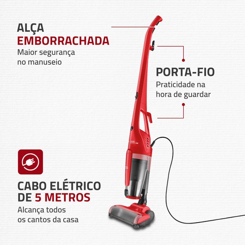 2 EM 1: Possui haste removível e pode ser utilizado como aspirador vertical ou portátil. Na versão portátil, ele é perfeito para limpeza de estofados, carros e teclados.