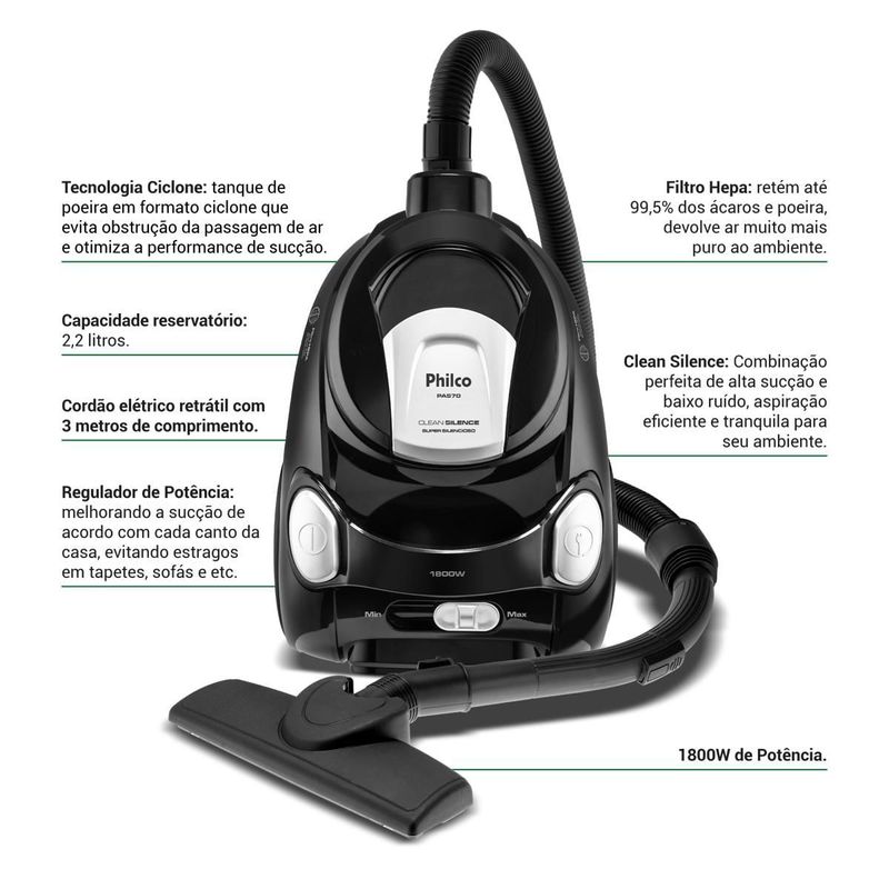 Aspirador de Pó Philco 1800W 2,2L Super Silencioso PAS70, prático e versátil, o melhor aspirador para o seu dia a dia!